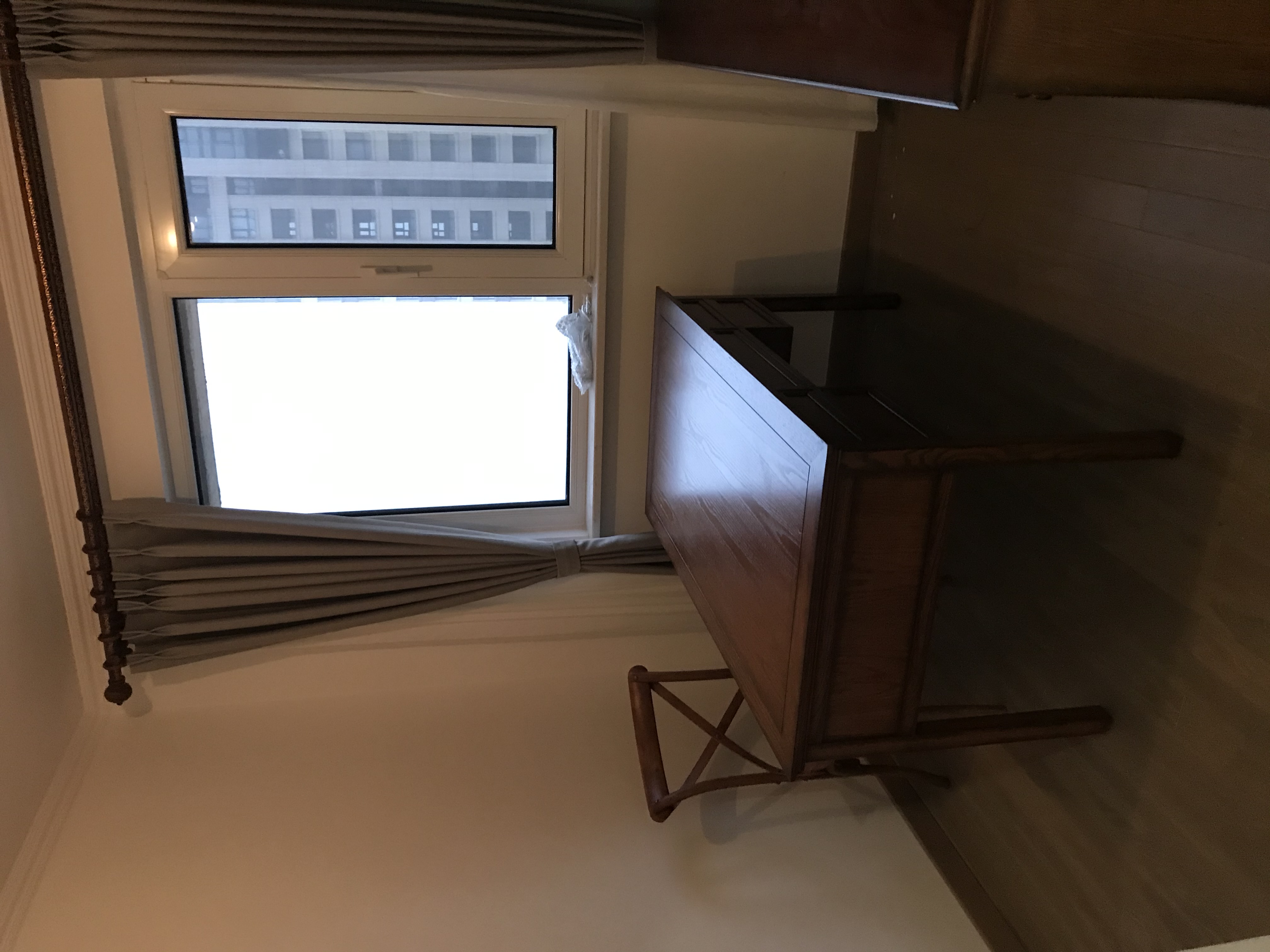 The dark brown solid wood desk paired with a cross-backed chair features a simple design that fits the spatial scale. Placed by the window, it brings in abundant light, meeting the needs of office work and writing. The blank walls and shallow floors create a simple atmosphere.