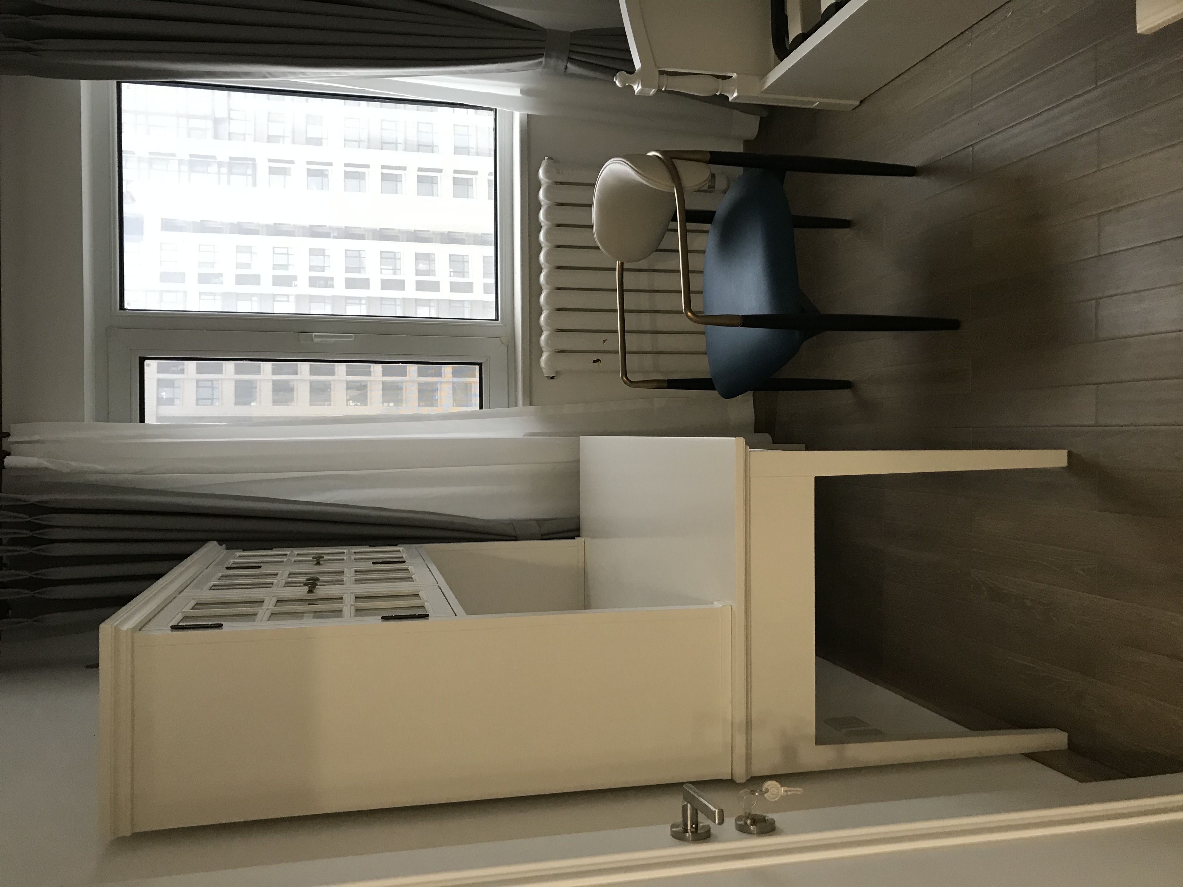 The light white desk and bookshelf combination features simple and elegant lines, which match the bright tone of the space and provide a tidy countertop for reading and working. Paired with blue and grey soft-padded seats, it adds comfort and color gradation. The window layout creates a quiet atmosphere with natural light, making it an ideal corner for calming thoughts.