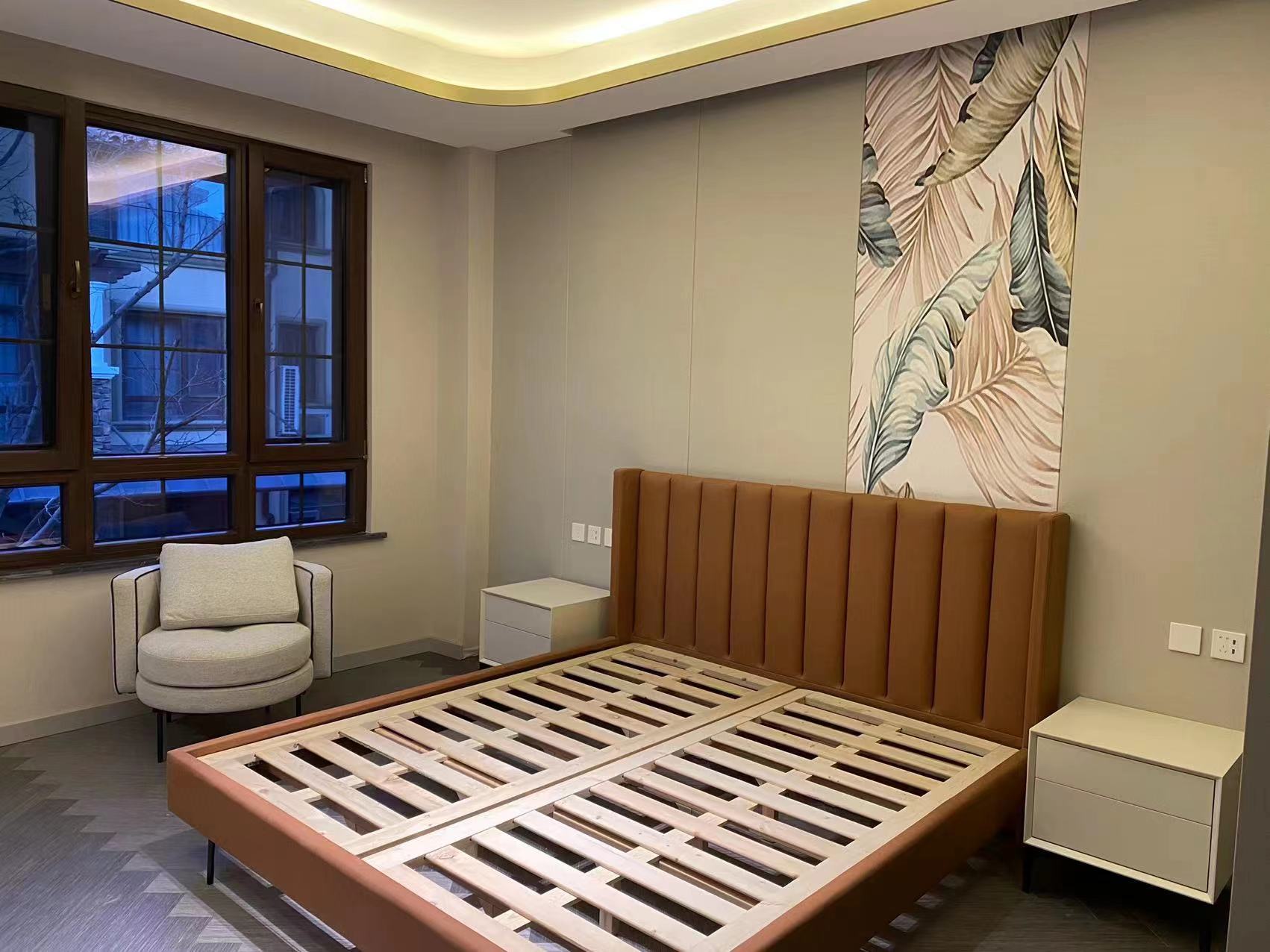 The double-circle art installation on the background wall, with the marble texture complementing the metal rings, makes the sleeping space both ritualistic and full of a warm atmosphere.