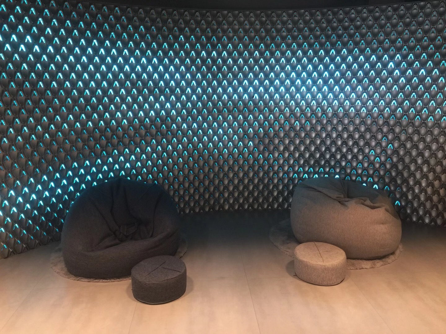 The walls are designed with regularly arranged blue light modules, presenting a strong sense of technology and futurization. The soft and comfortable bean bag chairs and round stools create a relaxing and leisurely atmosphere. The combination of the two not only has a visual impact but also allows people to relax.