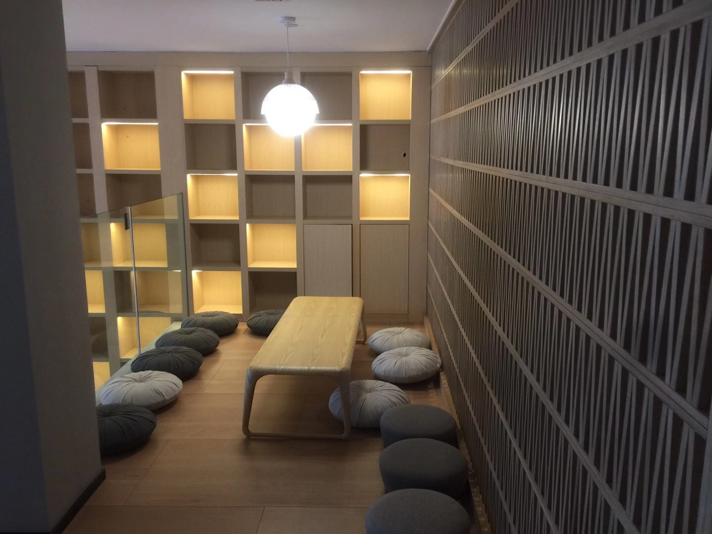 The long wooden table, the storage cabinet with light strips, and the round-shaped cushions all exude a natural warmth and a sense of comfort and relaxation throughout the space.
