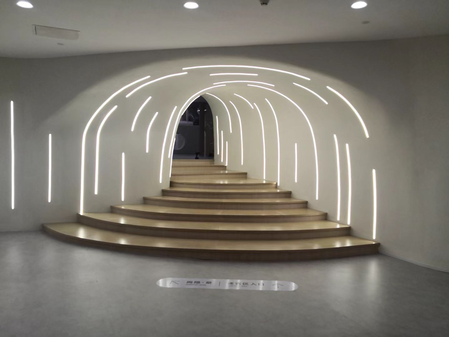 The overall design is dominated by simple lines and soft tones. The arc-shaped tunnel shape, combined with linear lighting, creates a smooth and futuristic visual effect.