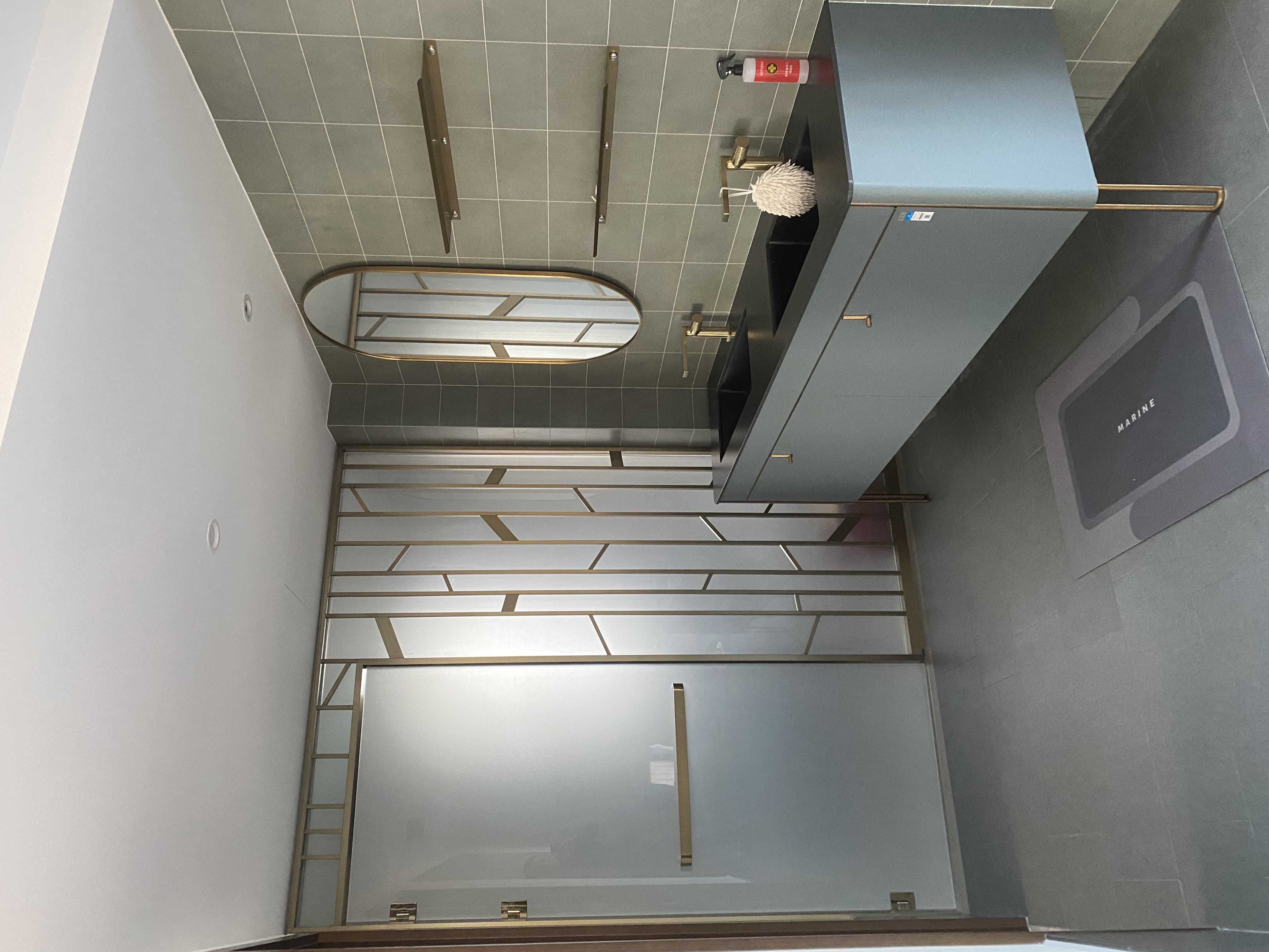 The main color scheme is grey, creating a calm and grand atmosphere. Paired with golden metallic materials, it adds a sense of refinement and luxury.