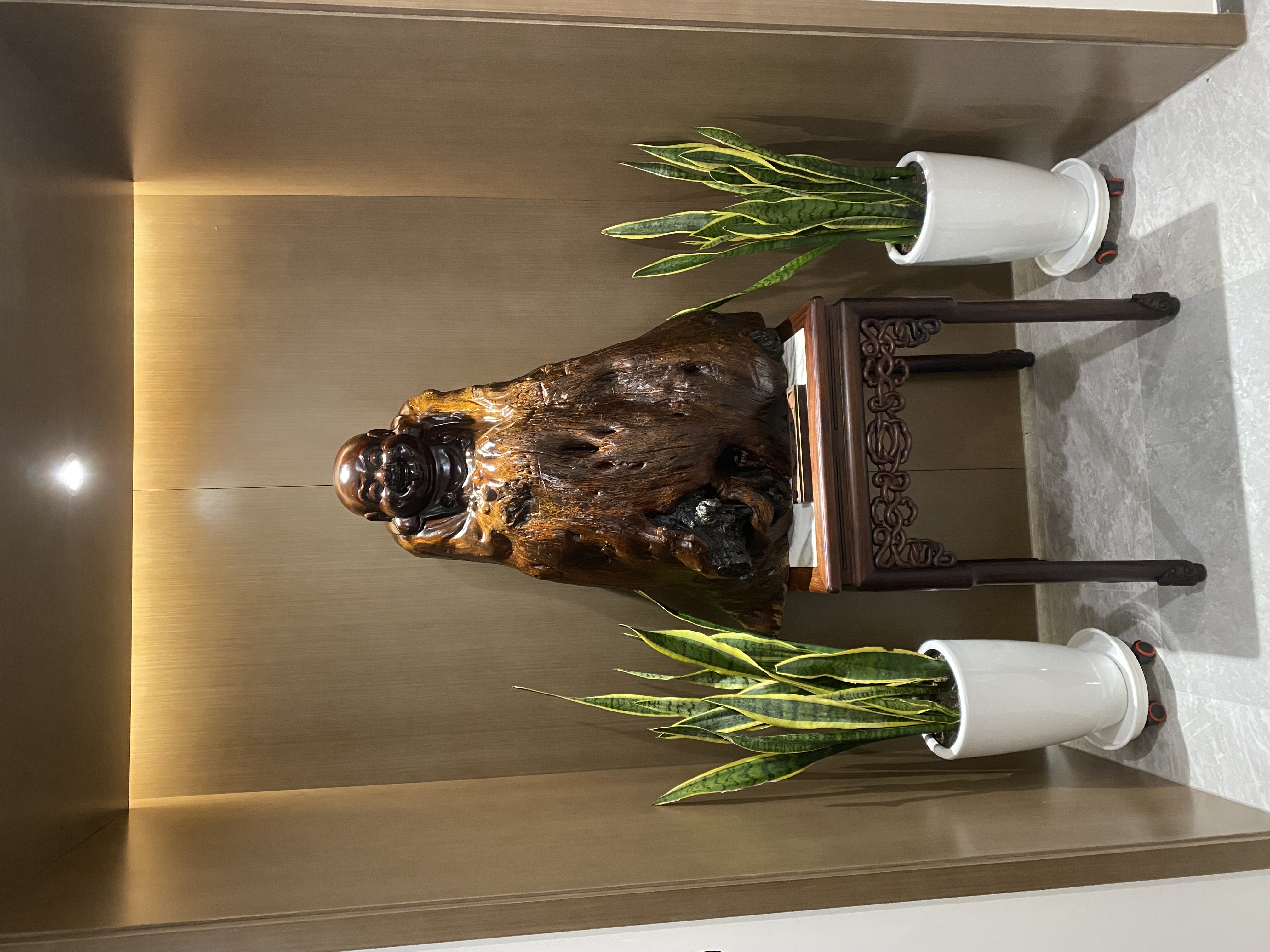 The wood-carved Maitreya Buddha and the carved Chinese-style small table are representatives of traditional elements. The modern wall materials and the white flower POTS with wheels reflect the practicality and simplicity of modern design. The overall design not only inherits traditional culture but also showcases a comfortable modern living atmosphere.