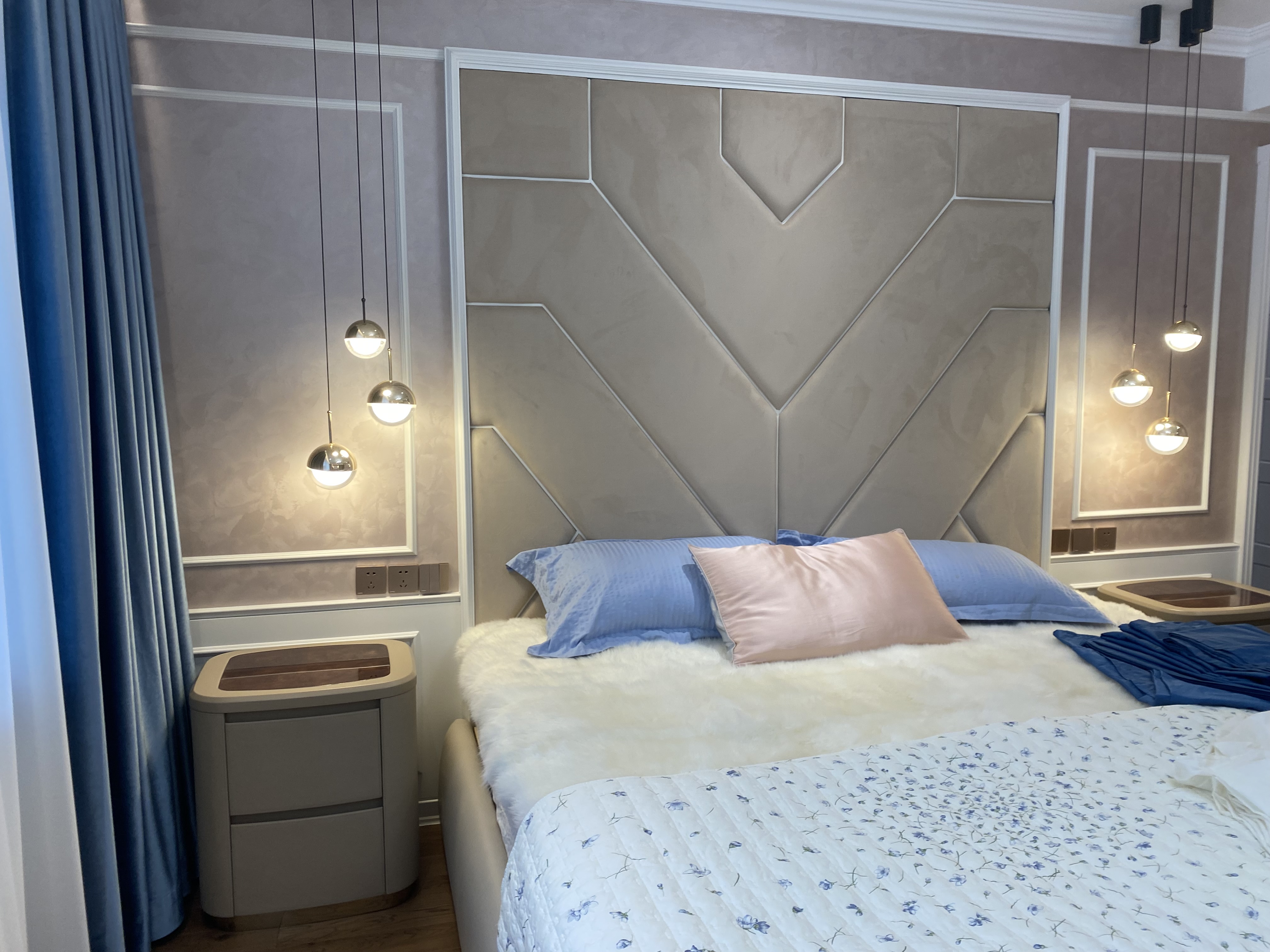 The headboard background wall is a soft package with geometric shapes, paired with hanging spherical lamps, light-colored bedding with floral patterns, and blue and pink throw pillows that are fresh and warm. The bedside table beside it is simple, and the overall design is exquisite and elegant.