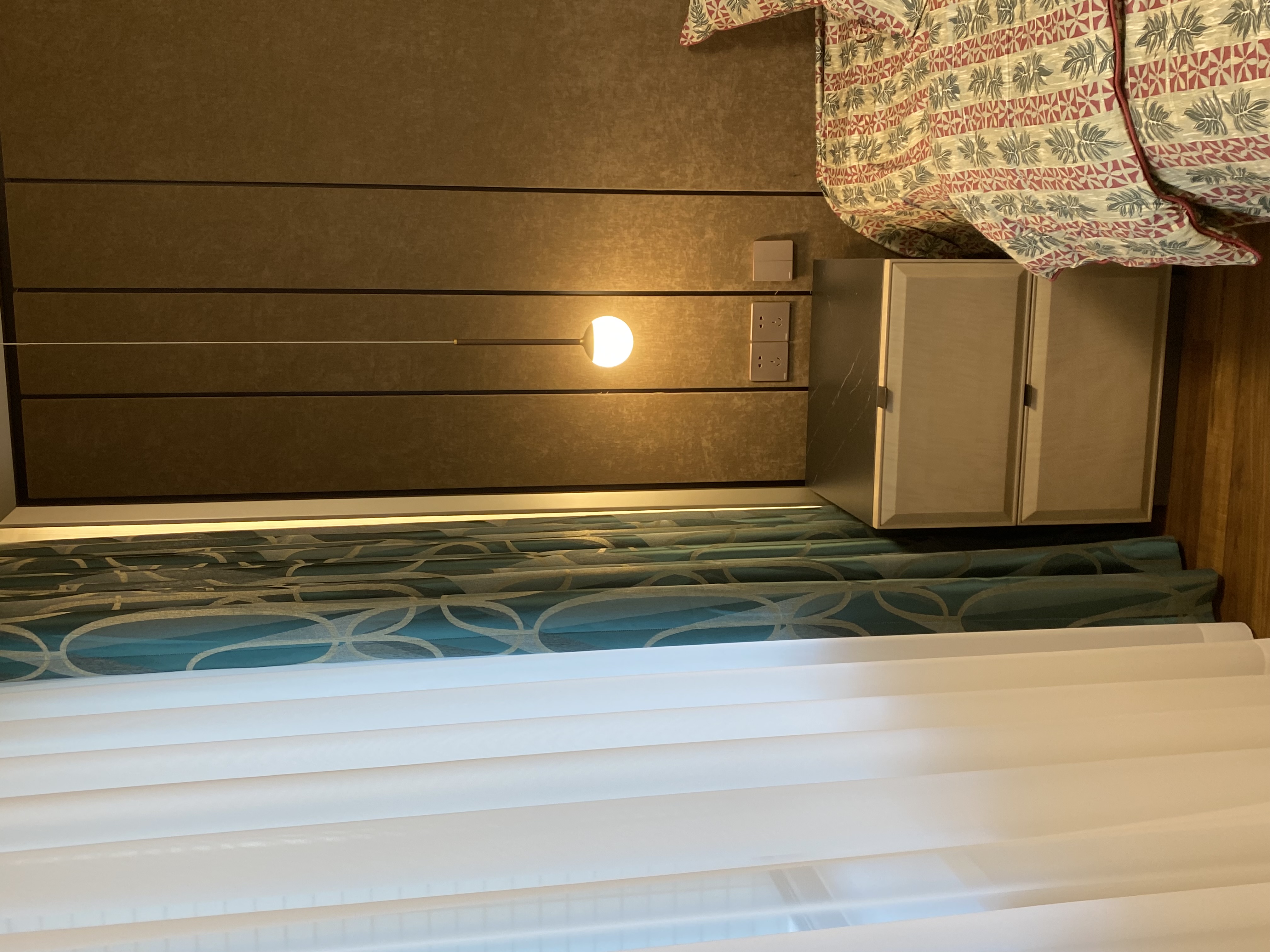 The walls are decorated with dark-colored panels, complemented by simple hanging lamps and plant-patterned bedding, which are rich in color and full of vitality. The bedside table is simple and practical. The circular patterned fabric curtains and white gauze curtains add a sense of spatial layering. The overall look is both stable and full of personality.