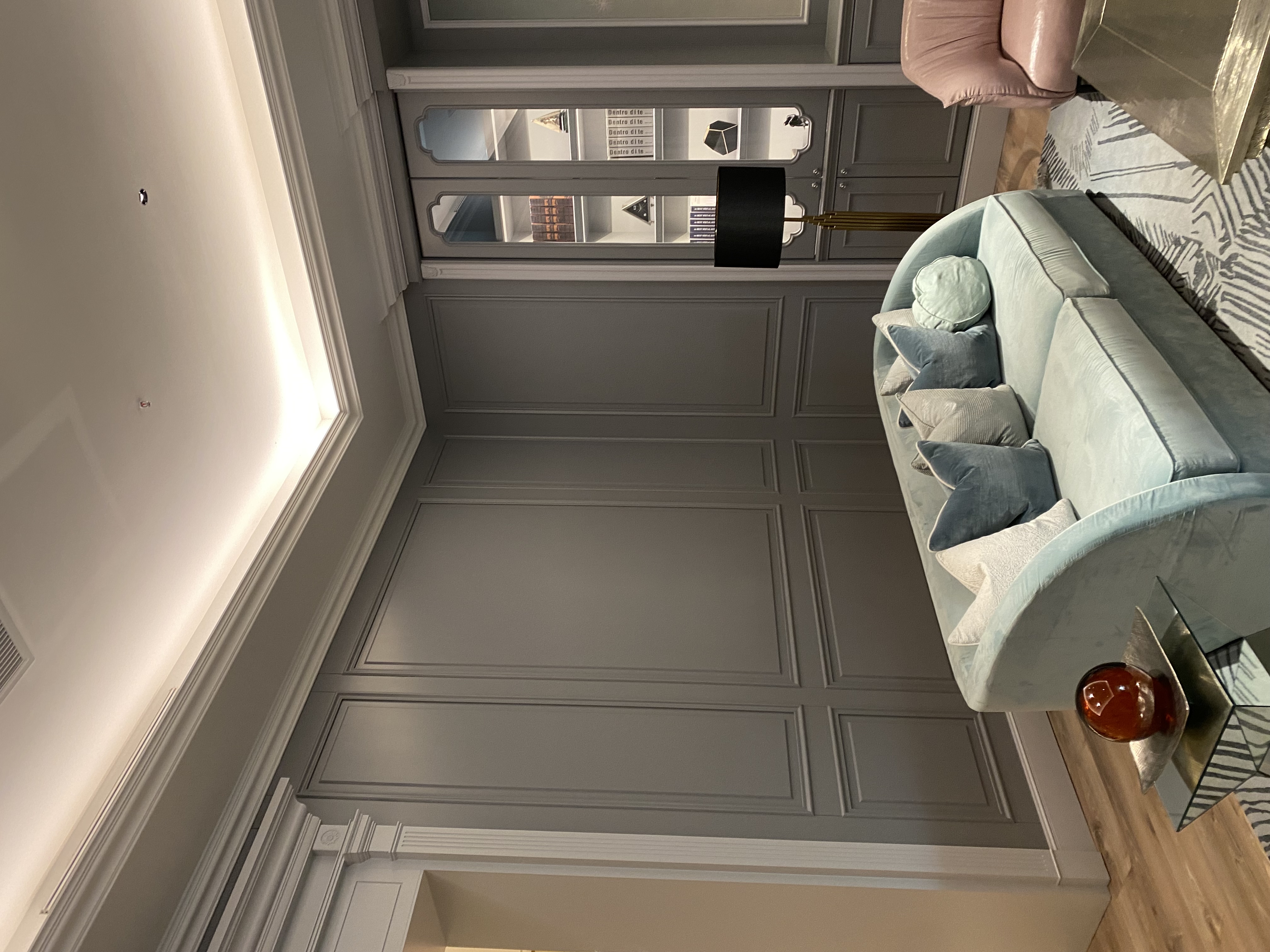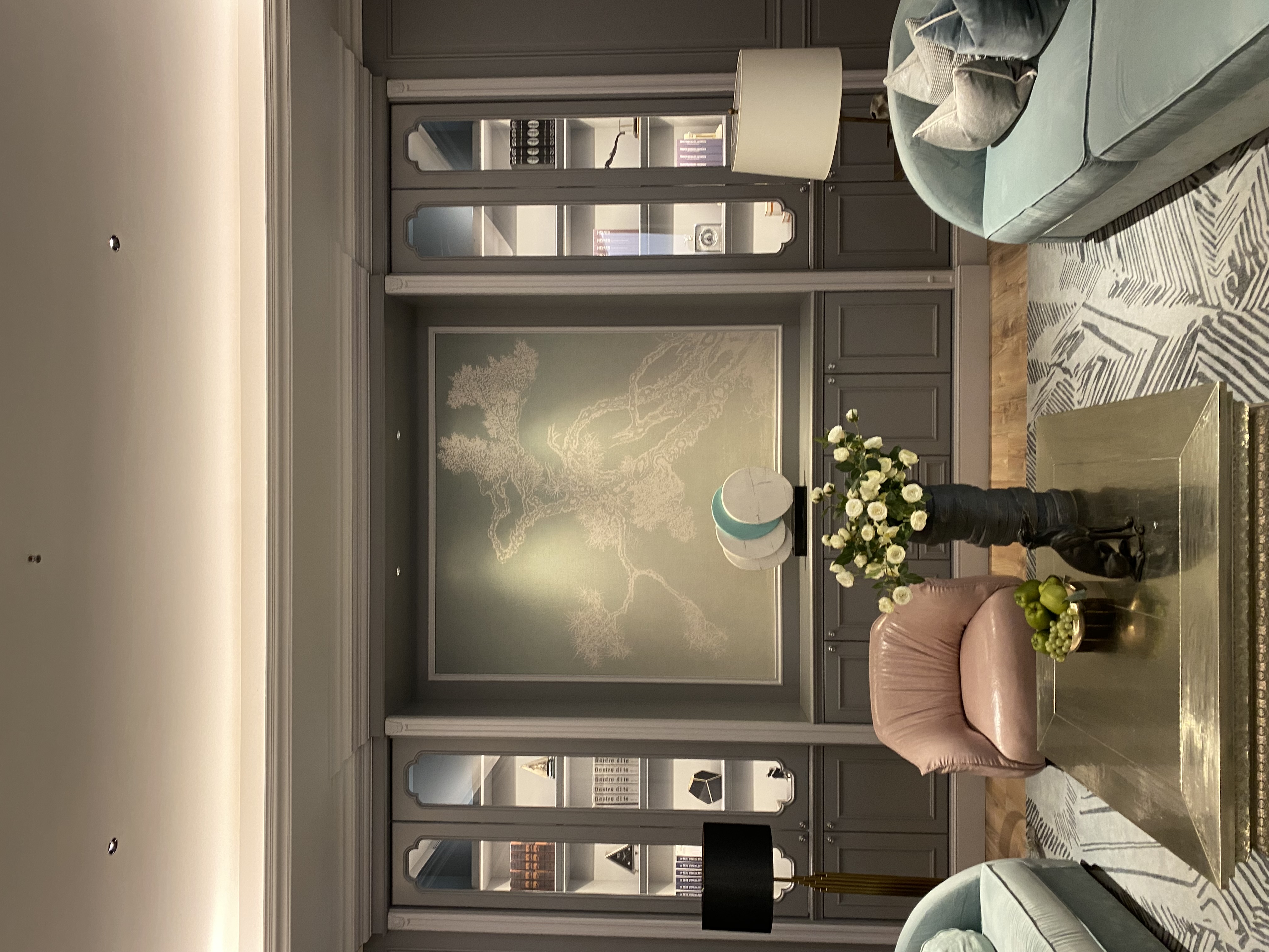 With a calm grey as the main color tone, it is complemented by light blue and pink suede sofas, metallic coffee tables and glass cabinets, enhancing the luxurious feel of the space. The details such as murals, ornaments and lamps blend classical and modern aesthetics, being exquisite, elegant and full of artistic sense.
