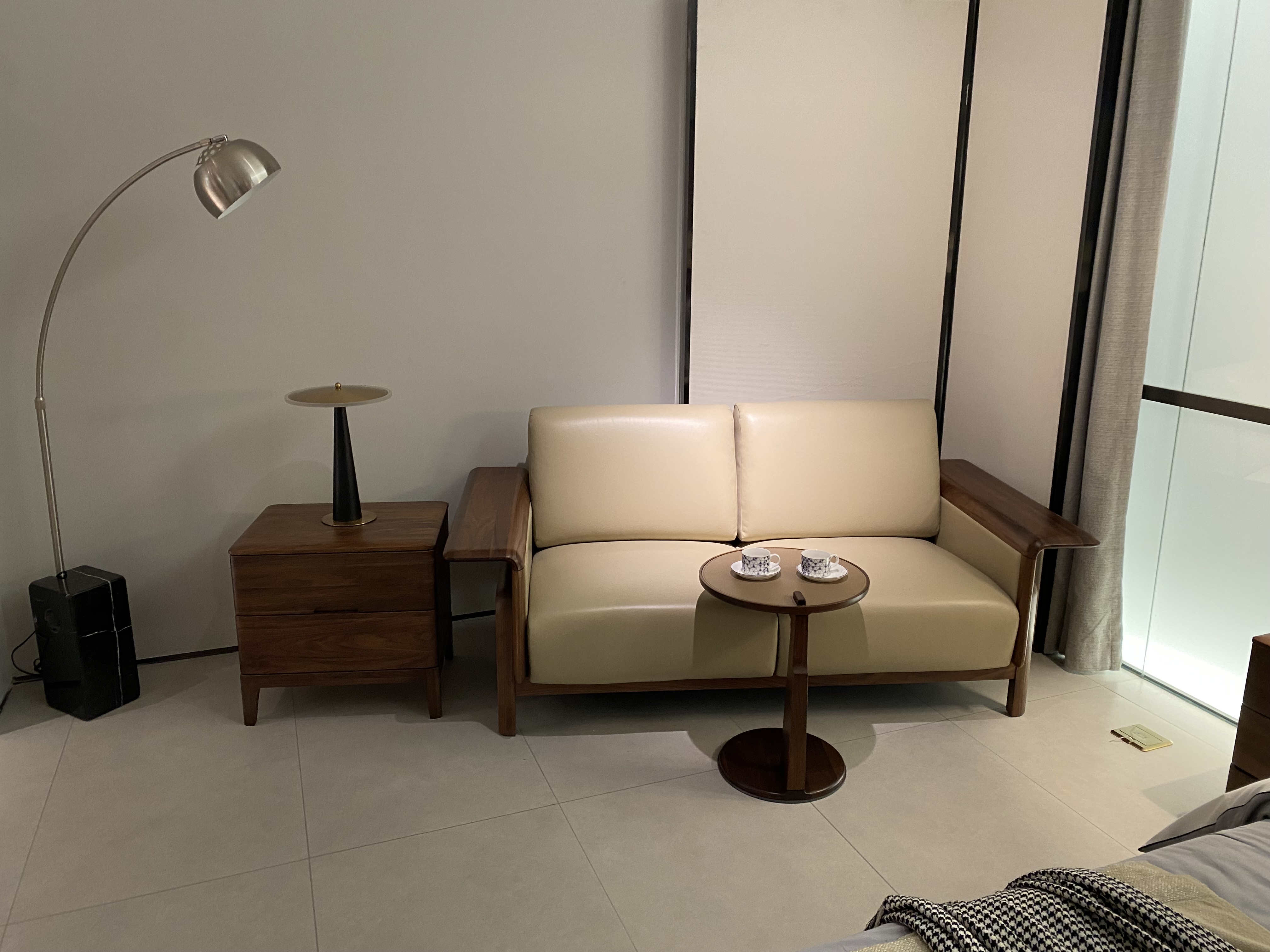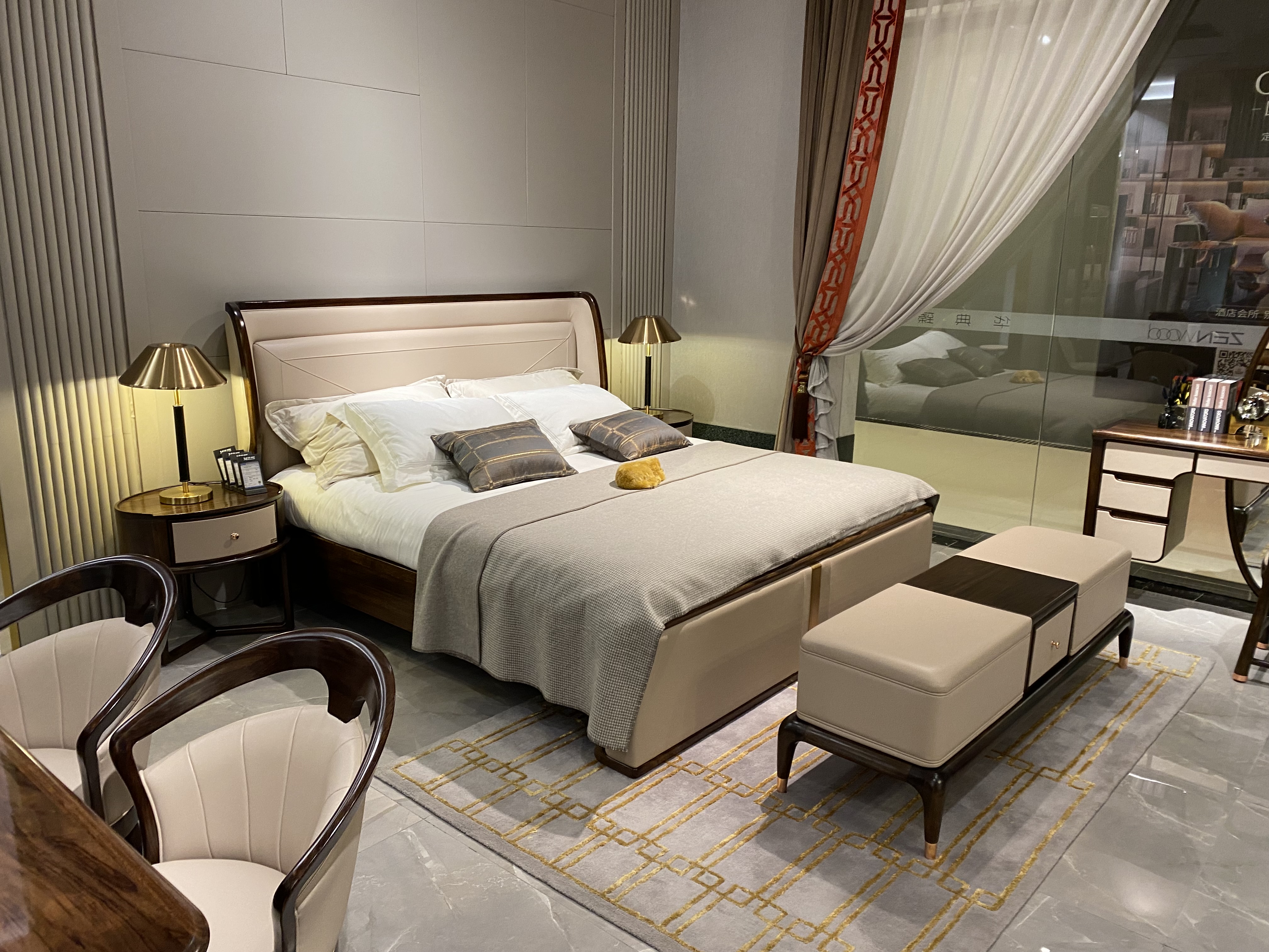 The solid wood material combined with soft light-colored soft furnishings is elegant and grand. The furniture design combines Chinese charm with modernity, presenting a simple and elegant look.