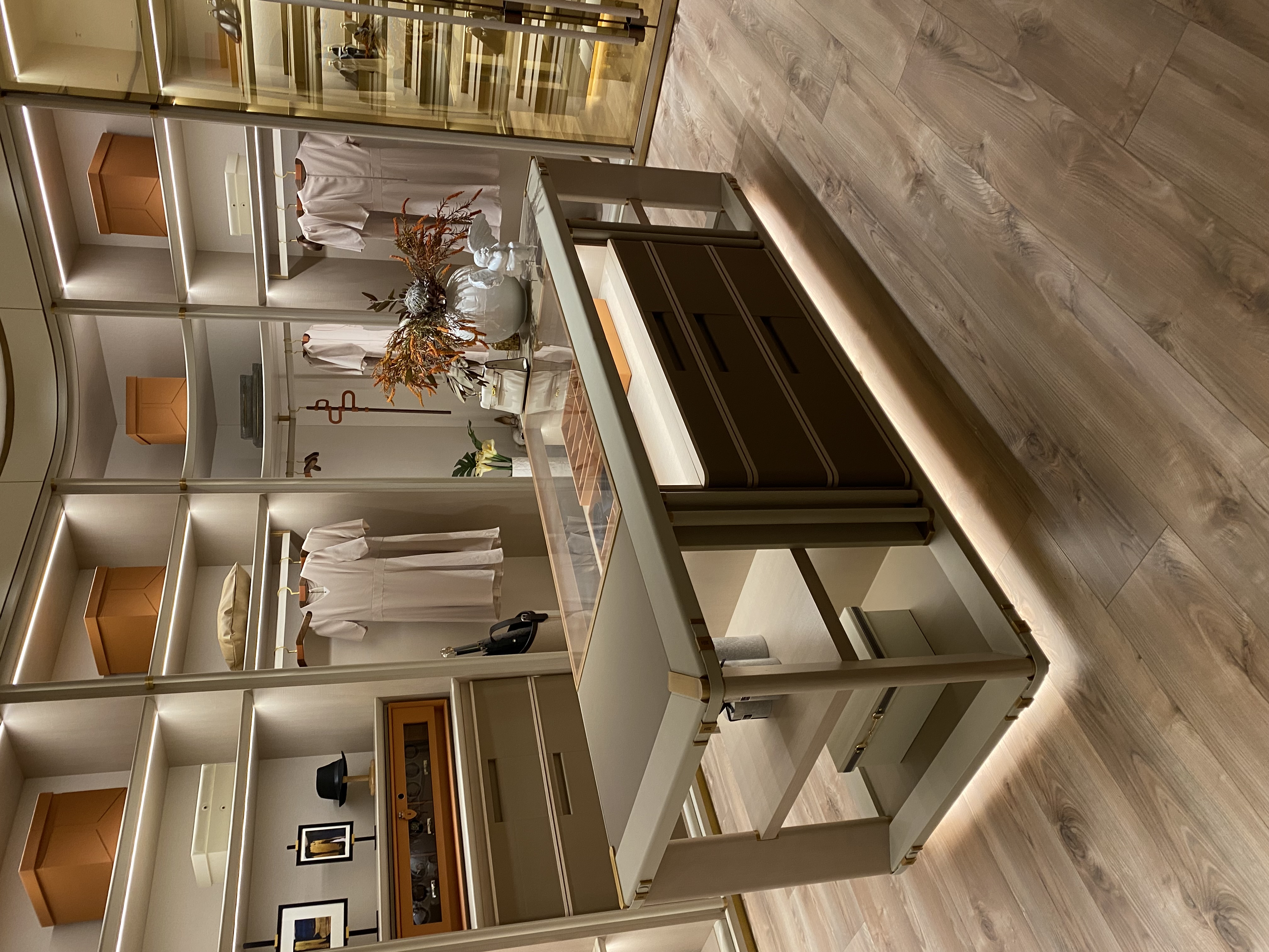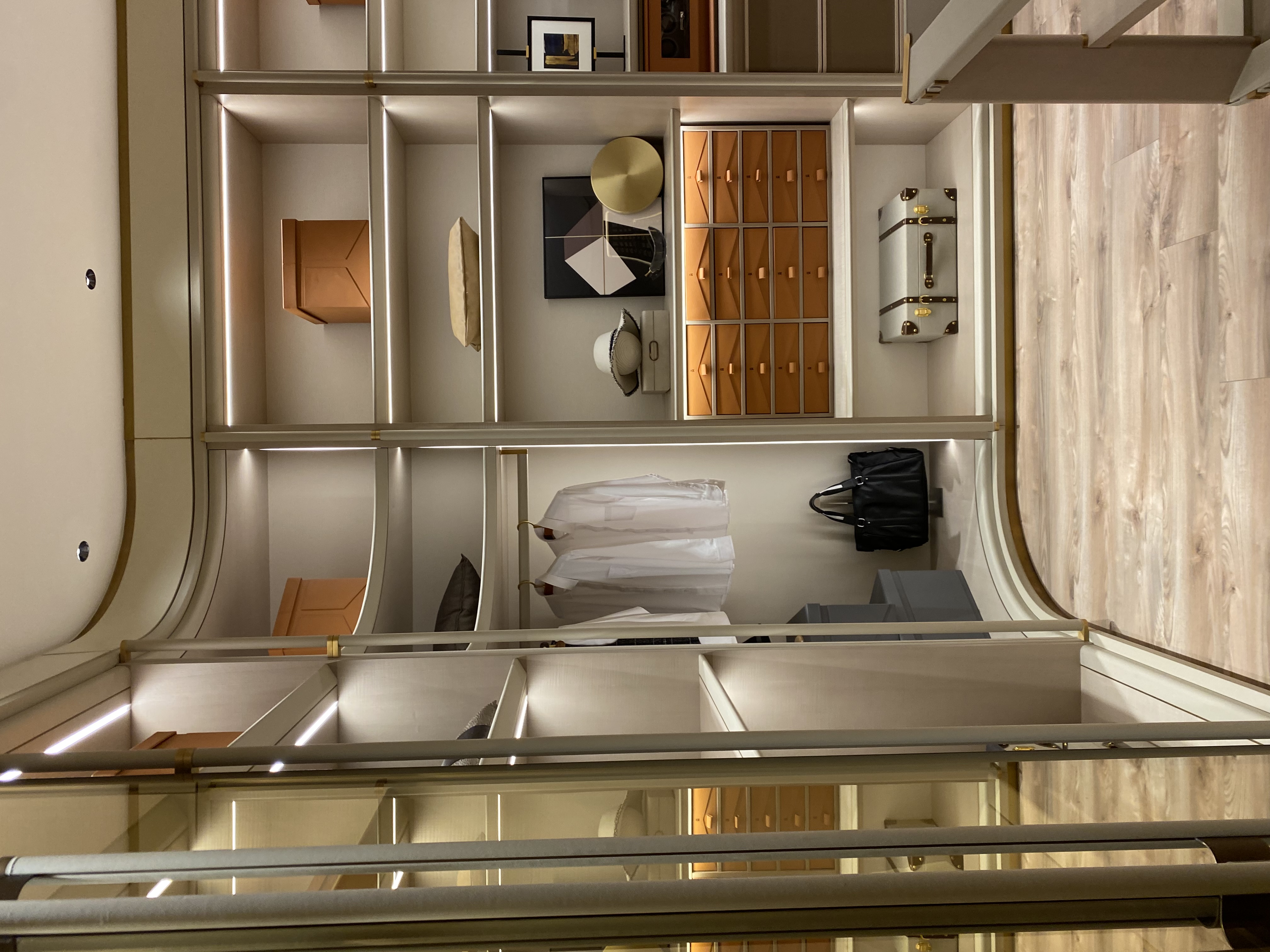 The spatial layout is clearly divided into functional zones, covering areas such as clothing hanging, storage box placement, and accessory display, meeting diverse storage needs. The built-in lighting design, exquisite floral arrangements, ornaments and decorative paintings all highlight the style.