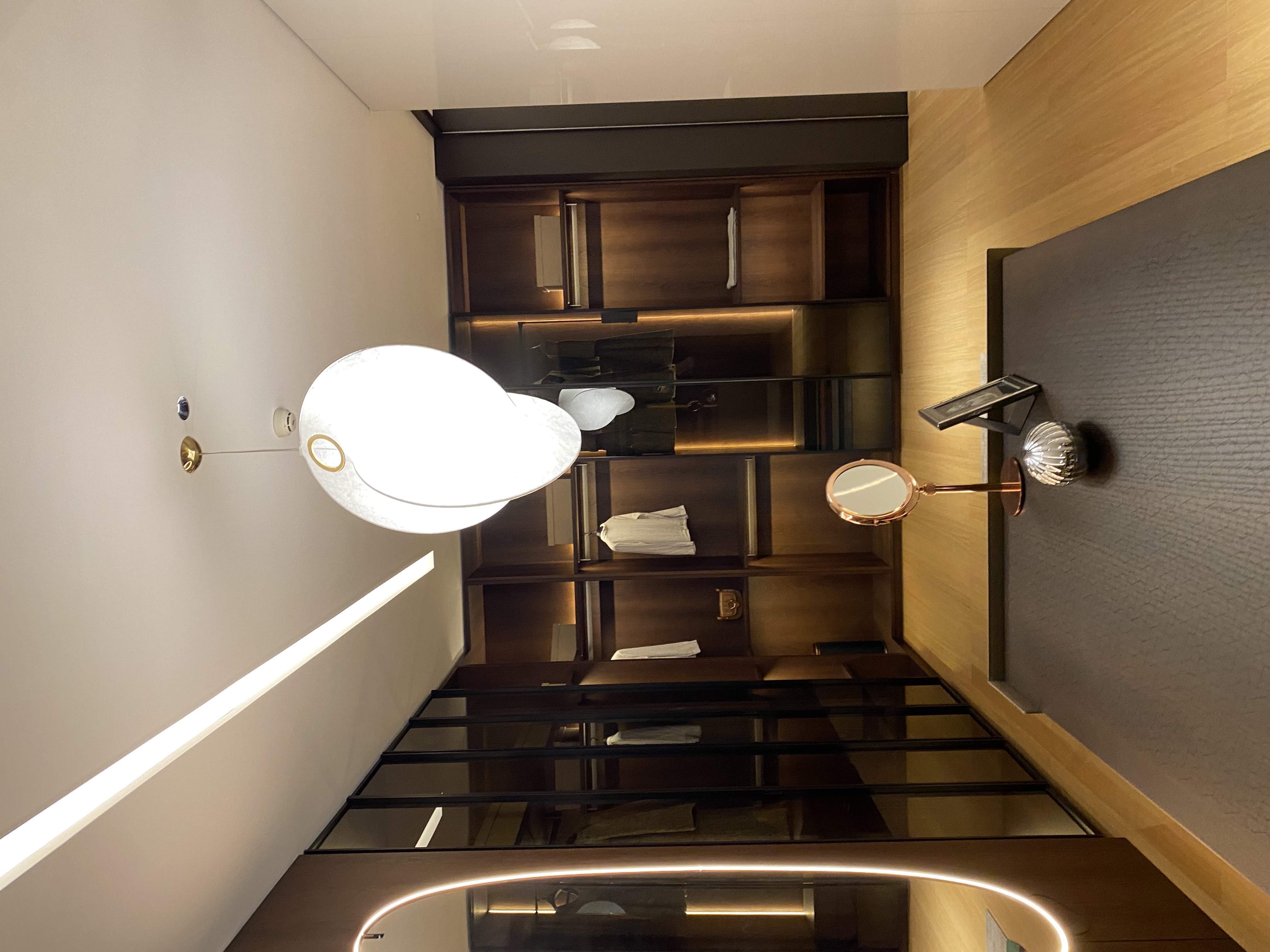 The main feature is dark wooden cabinets, complemented by uniquely shaped chandeliers, exquisite ornaments and light mirrors, which add an artistic sense and refinement, presenting an elegant and textured storage space.