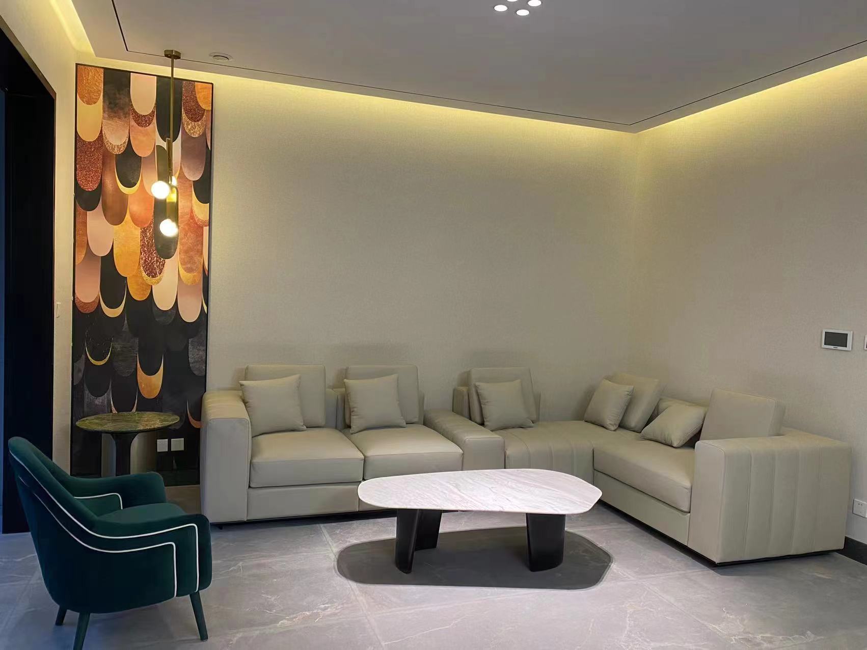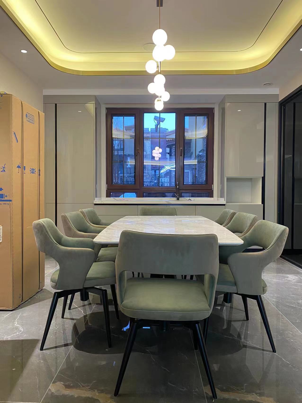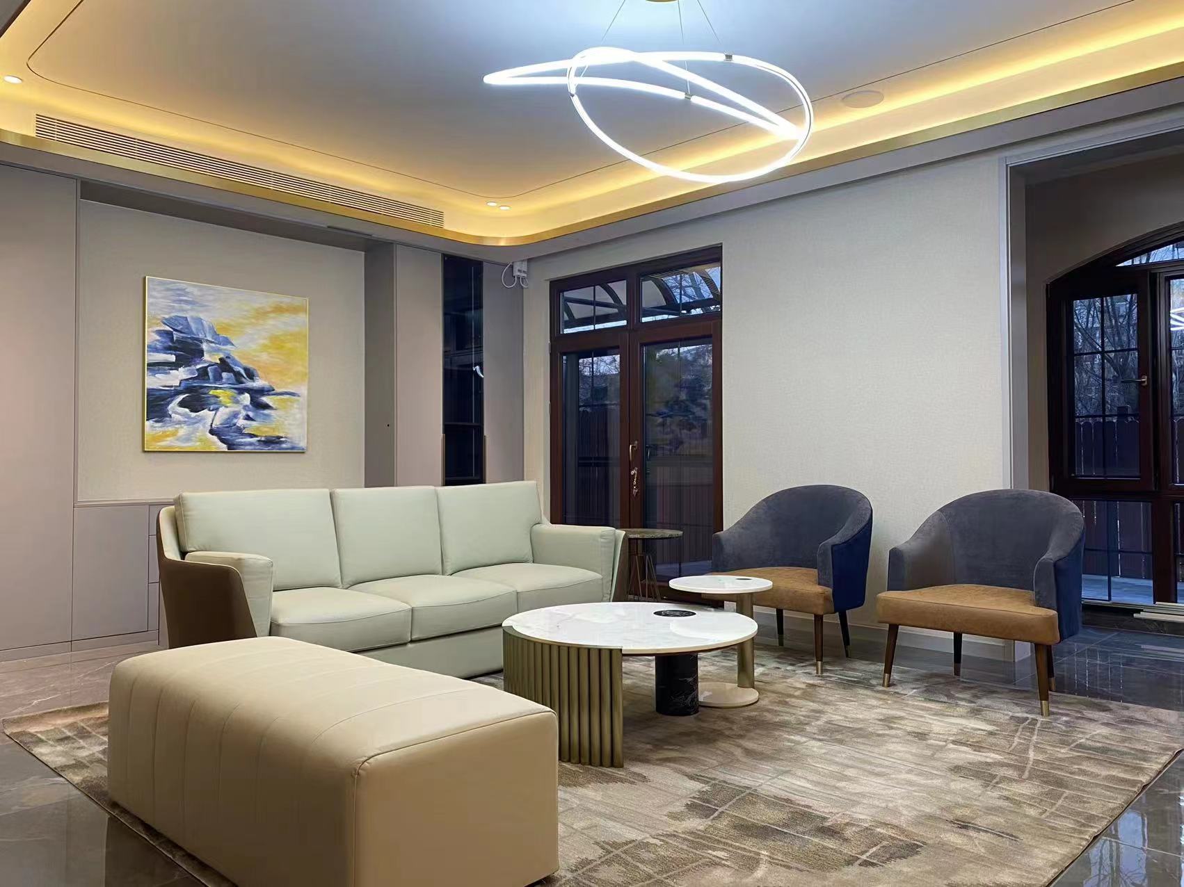 The comfortable core area is constructed with a light beige genuine leather sofa. Next to it, a dark green velvet single chair is highlighted with a contrasting color, and a white line Outlines a neat contour. The artistic hanging painting on the left becomes the visual focus. Paired with a golden chandelier and a small round marble table, the collision of metallic texture and natural stone naturally reveals a sense of light luxury in the details.