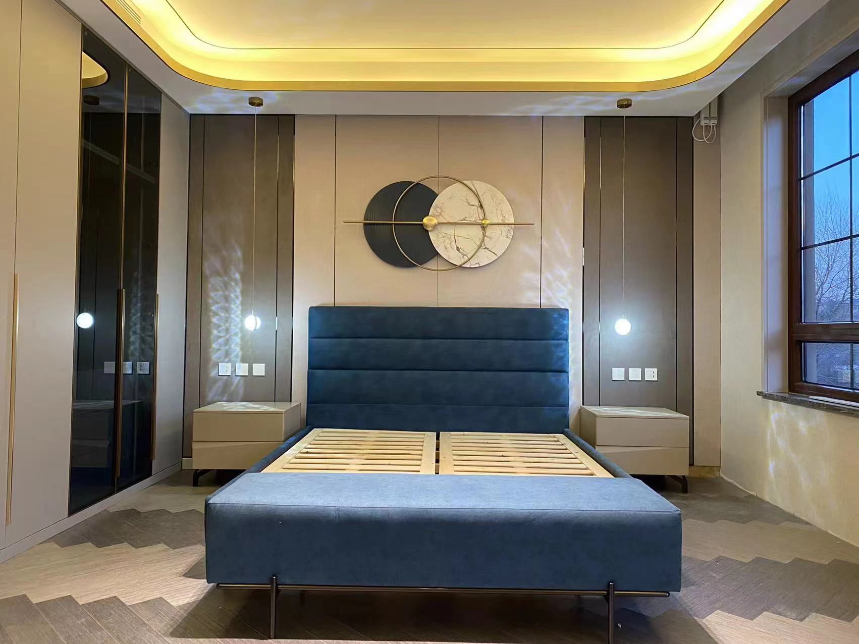 The double-circle art installation on the background wall, with the marble texture complementing the metal rings, makes the sleeping space both ritualistic and full of a warm atmosphere.