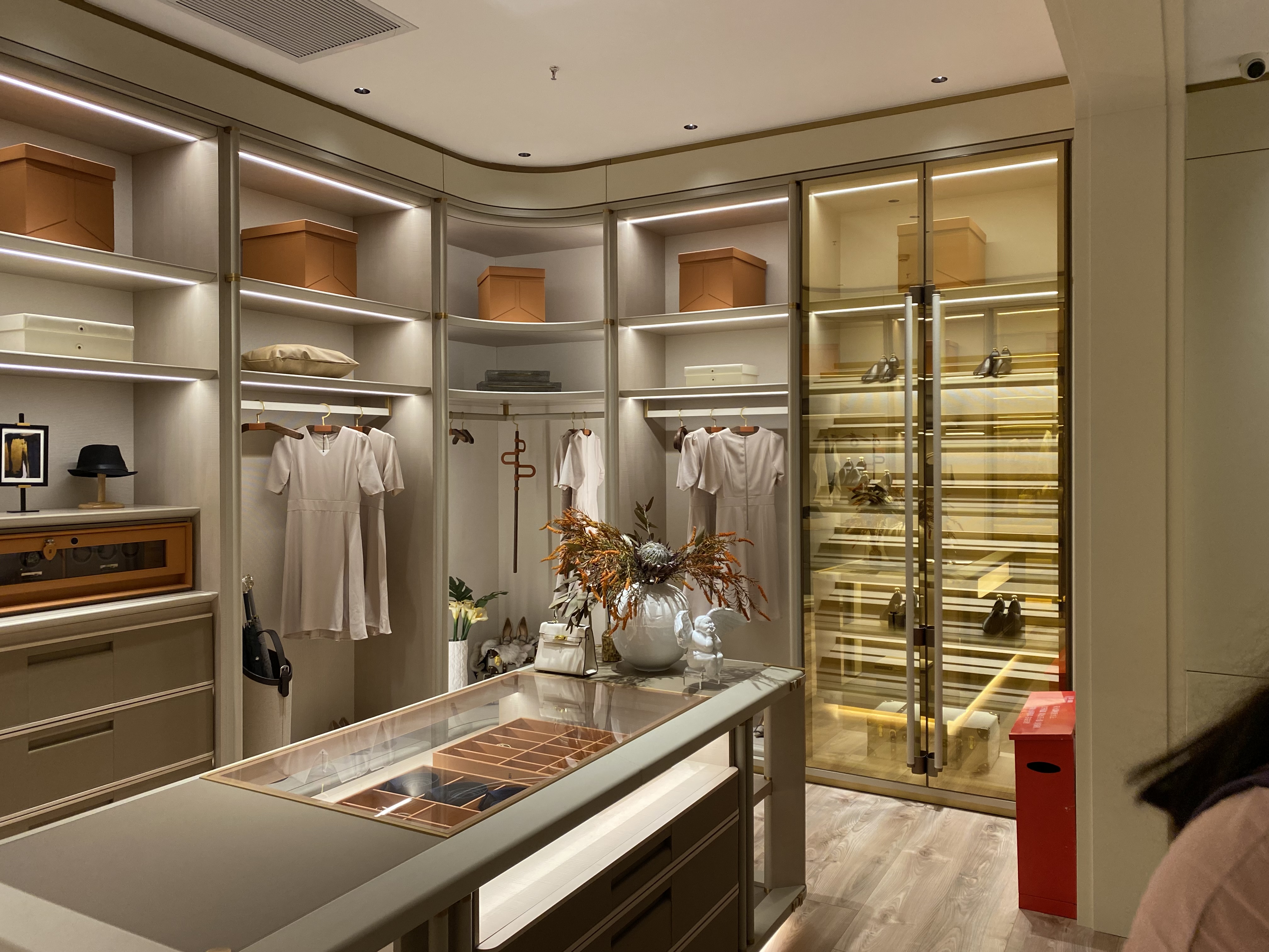 The spatial layout is clearly divided into functional zones, covering areas such as clothing hanging, storage box placement, and accessory display, meeting diverse storage needs. The built-in lighting design, exquisite floral arrangements, ornaments and decorative paintings all highlight the style.